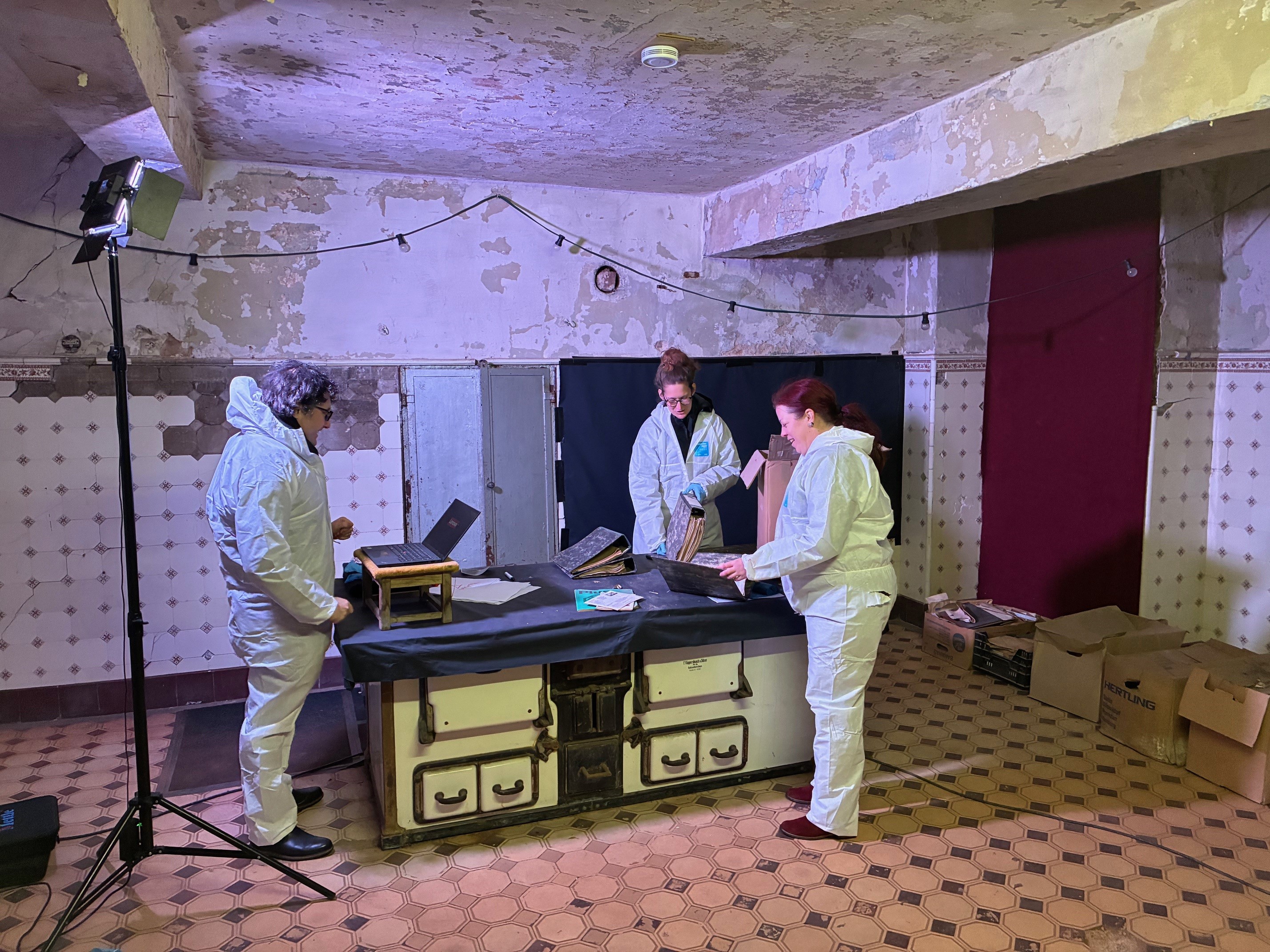 In der winterlichen Atmosphäre der historischen Schlossküche wurden zehn Umzugskartons und etwa 160 Ordner mit Unterlagen aus dem Besitz der Grafen von Hoensbroich einer archivischen Bewertung unterzogen. Hierbei wurden Unterlagen ohne bleibenden dokumentarischen oder historischen Wert zur späteren datenschutzkonformen Vernichtung ausgesondert, die „archivwürdigen“ Unterlagen hingegen werden unter Beachtung der Grundsätze der Bestandserhaltung, Erschließung und Zugänglichmachung dauerhaft bewahrt. Die Überlieferung stammt aus dem 20. Jahrhundert und umfasst sowohl Privat- als auch Geschäftsunterlagen von den verschiedenen rheinischen Wirkungsstätten der Familie.